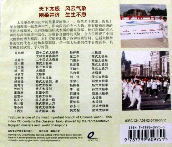 天下太极 风云气象  刚柔并济 生生不息   太极拳是中国武术的最重要流派之一。历代名手辈出,近几十年来涌现出一批蜚声中外、影响深远的杰出人物。既有精修深研的民间太极拳家,也有扬威国际武术界的世界冠军。他们高超的武术功底与武学修养相结合,形成各自独特的风格,全方位展现了中国太极拳的博大精深。 本片实拍并汇集了各种珍贵资料,包括太极拳各流派的代表人物和典型套路。是一部太极拳的技术音像百科,具有极高的欣赏、学习价值。 陈思坦 四十二式太极拳 太极剑竟赛套路 邱惠芳 二十四式太极拳 陈小旺 陈式太极拳 冯志强 陈式太极拳 杨丽 太极扇 林秋萍 太极拳 李秉慈 吴式太极拳 杨振铎 杨式太极剑、拳 周育玲 孙式太极拳 乔松茂 武式太极剑 王海洲 赵堡小架 范雪平 竞赛太极拳 陈正文 陈式老架一路 陈兰茹 陈式春秋大刀 陈小兴 陈式太极推手 王西安 陈式新架二路 孙祥东 太极剑 王二平 陈式太极拳 门惠丰 东岳太极拳 陈正雷 陈式太极剑 王培生 吴式太极刀 苏自芳 太极拳 刘 伟 吴式太极拳 原宝山 赵堡太极拳 杨振基 杨式太极拳 李 强 孙式太极拳 赵增福 赵堡太极拳 高佳敏 太极拳 夏柏华 太极剑 孙永田 孙式太极拳 吴文翰 武式太极拳 [安全检测] 已通过安全检测 杀毒软件:McAfee VirusScan v8.0 中文版 病毒库 2007-05-04 [共享服务器]DonkeyServer No1 或 DonkeyServer No2 [共享时间] 每天不定时上网,请大家多多分流。谢谢!