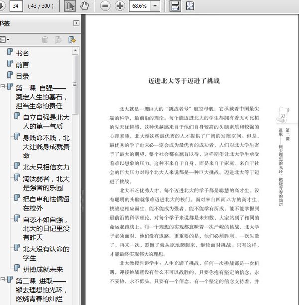 : 第YI课自强——奠定人生的基石,担当生命的责任 自立自强是北大人的第YI气质 身贱命不贱,北大让贱身成就贵命 北大只相信实力 淘汰弱者,北大是强者的乐园 把自卑和怯懦留在校外 自恋不如自强,北大的日记里没有昨天 北大没有认命的学生 拼搏成就未来 第二课进取——褪去理想的光环,燃烧青春的灿烂 迈进北大等于迈进了挑战 给发热的头脑冲冲凉 在精英的天堂里当好“丑小鸭” 博雅塔下站立的是硬汉子 每一天都从零起步 在压力下燃烧青春 不做理想主义者 认清现实才能取得成功 危机感强于无忧感 第三课思考——激发思想的力量,掌握成功的钥匙 独立思考是北大之魂 没有思考就没有发现 缜密思考才能凯旋而归 不会选择是因为不会思考 再思考3分钟结果就大不一样 思考得越多成功越快 挫败者ZUI缺乏的是专心思考 第四课心态——直面自我的风范,无欲则刚的境界 保持对自己的批评精神 当不了DING尖大师就当DING尖凡人 挑战自己埋头做事 保持一颗平常心 强争不如善让 知退知进,进退自如 第五课处世——人情练达的学问,洞悉世事的真知 天不言自高,海不言自深 强手如林更需放低心态 成于谦虚,败于骄狂 低成才能高就 北大不欢迎逞能好强 藏起锋芒,稳步前进 谨慎张扬自己的个性 严谨是人生的美德 第六课包容——海纳百川的胸襟,成就大业的气度 包容是北大第YI品格 做人的ZUI高境界是包容 低处修心,高处容人 心有多大,人生的舞台就有多大 以德报怨胜过以怨报怨 豁达大度品自高 第七课学习——博采知识的营养,打造竞争的资本 学海无涯,博学才能多才 树立终生学习的理念 兴趣是学习的动力 在兴趣中寻找人生突破口 把自己的兴趣做深做透 做精专业才能成就状元之路 追求要达到痴迷的程度 向时间窃贼宣战 第八课信义——通行天下的准则,终生受用的财富 诚信比金子更可贵 要成功更要诚信 北大不容忍虚伪 善良的前提是诚信 信守诺言 诚信是打开心锁的钥匙 诚可服众,欺必伤人 诚信创造好运 真诚待人必然收获真诚 第九课挫折——百炼成钢的意志,锻造成功的辉煌 摔打是人生的必修课 成功在于再坚持一步 始终坚信我能行 培养积极向上的精神 像水一样锲而不舍 挖掘自身的成功潜能 谁笑到ZUI后谁就是ZUI好 勇敢可以让失败退步 忍耐挫折就是等待成功 第十课感恩——照耀心灵的太阳,人生幸福的源泉 谋得高位,成为人上人 满怀爱心,施爱于人 爱人比恨人更快乐 送人快乐,加倍快乐 每天保持好心情 笑对人生