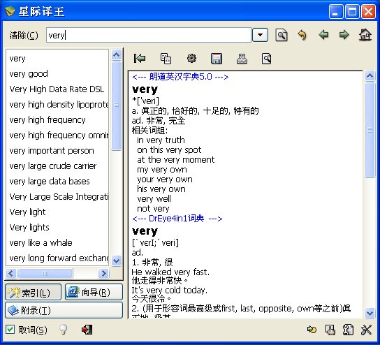 同时这个版本还内置了很多常用的内容,包括了字典、真人发音语言包、信息速查以及Adobe PDF文件取词插件等。 内置的字典包括了3种最常使用的字典: 1、朗道英汉字典5.0 2、朗道汉英字典5.0 3、DrEye4in1词典 如果需要其他语种字典或专业词典请到StarDict的官方网站或http://lib.VeryCD.com/2006/04/07/0000097704.html这个帖子下载。 官方网站简体中文类字典下载: http://stardict.sourceforge.net/Dictionaries_zh_CN.php 金山词霸词典: http://stardict.sourceforge.net/Dictionaries_PowerWord.php 包括了金山词霸2003~2007版本出过的所有词典 日语类字典: http://stardict.sourceforge.net/Dictionaries_ja.php 还有俄语、德语、法语、以及很多小语种都可以找的到如:捷克语、波斯语、韩语、越南语等等甚至可以找到维吾尔语的字典。~~ 下载后的字典压缩包只要将压缩包里的文件夹解压到bin目录下的Dic文件夹下面就OK了,是不是很方便呢。 这个绿色版本还包括了真人发音语音包WyabdcRealPeopleTTS,这个语音包由一男声和一个女声给您带来纯正的英式发音。 至于信息速查,类似于金山词霸的实用工具啦