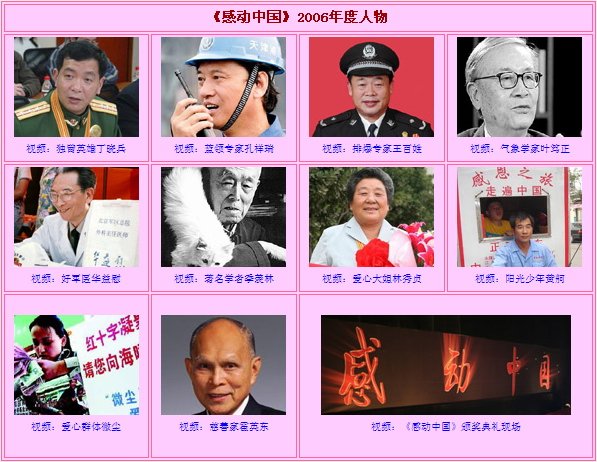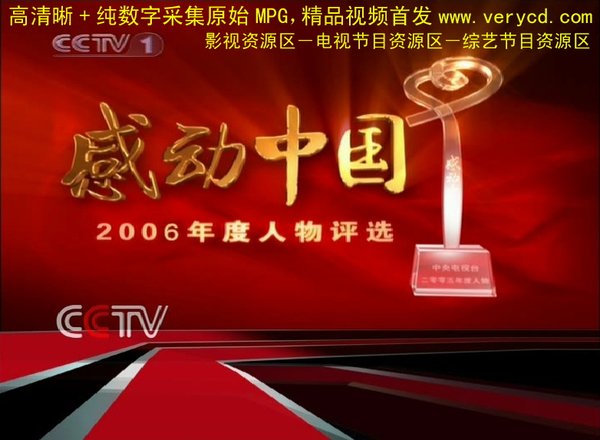 CCTV.com消息:历时两个多月的评选,中央电视台《感动中国2006年度人物评选》活动已经结束,揭晓评选结果颁奖盛典于2007年2月26日(正月初九)隆重播出。