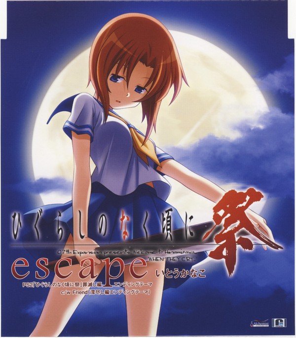 「ひぐらしのなく顷に祭」エンディングテーマ: escape http://www.neowing.co.jp/pictures/s/03/32/VGCD-1006.jpg 商品番号: VGCD-1007 メディア: CD 组枚数: 1 発売日: 2007/02/22 価格: 1260円(税込)