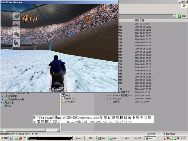 转自SHAREVIRUS 游戏类型:RCG 把\Streams\Music\00-09\vssver.scc复制到游戏根目录下就不会提示要你插入CD了! sillychild tested ok on 2007-3-3 with 1st pic posted! 简介:(本人亲自翻译自官方网站的介绍,水平有限公司,如有不妥请见谅) 本游戏已获得川崎公司授权制作! 没机会开真的雪橇,就在这开吧,还支持多人游戏。在这里你老用尽一切方法甩开你的对手去争取第一,当然还要避免雪橇损坏才行呀! 经典的说句就是:排除万难去争取胜利! 游戏特点: 可以不分时段地比赛和挑灯夜战! 3种不同的难度 逐步解开的关卡 3种比赛模式:计时赛、单人赛和巡回赛 游戏配置: Requirements.: Computer, Windows 98/2K/ME/XP, Acrobat Reader