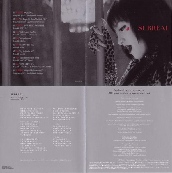Surreal几乎收录滨崎步先前所有单曲的混音版本,包括了单曲同名曲Surreal、由滨崎步本人主演『Takano Yuri』美容瘦身中心电视广告曲Duty、佐藤浩市、稻森泉主演日剧『天气预报的恋人』主题曲Seasons等多种混音曲风风。绝对是喜爱流行歌曲混成电子音乐版本的乐迷,不可错过的限量单曲。