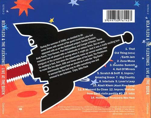 Béla Fleck可谓是世界班卓琴王,别人称赞他说:他通过许多很有特色和风格的演出、录音重新塑造了班卓琴的音色和形象。如果你熟悉他的音乐,你会知道他是一个酷爱班卓琴,并致力于把它放在独特的音乐环境中的人。他前后获得20次“格莱美奖”提名,并九次获得该项大奖,而且获得奖项涉及到现代爵士、流行乐器曲、世界音乐、新约、现代古典、乡村乐器曲、现代民谣、蓝草、作曲等多个不同领域。这在“格莱美奖”历史上是绝无仅有的。在近30年的音乐生涯中,他能演奏包括蓝草、爵士、流行、摇滚、世界音乐等不同的音乐形式。虽然他的名字是来自三位古典音乐作曲大师的名字:巴托克(Bartok)、德沃夏克(Dvorak)和杨纳切赫(Janacek),但他最近才开始涉及古典音乐。在第44届“格莱美奖”年度颁奖中,他第一次创作的古典音乐:2001年的《永动》荣获了2项格莱美奖。 最初他学习音乐是从吉他开始的,一次偶然在电视上看到的传统歌曲使他充满了兴趣,自此他转而开始弹奏班卓琴。由于生活在纽约,Béla Fleck能接触到风格各异的音乐,包括爵士乐。于是后来他开始用班卓琴演奏爵士乐 —— 一种前所未闻的音乐的融合。上个世纪八十年代,大部分时间Béla Fleck是在一个充满创新的蓝草乐队New Grass Revival中演奏,他们的音乐结合了蓝草,摇滚和乡村音乐。同时New Grass Revival的器乐专辑将班卓琴提升到了一个更加广泛的领域中。 1990年,New Grass Revival解散后,我们的班卓琴巫师组建了由爵士钢琴家Howard Levy, funk贝斯演奏家Victor Wooten和鼓手Roy Wooten组成的The Flecktones乐队。在当时,看起来他们只是田纳西州众多new-acoustic组合中不起眼的一员,或许很快就会昙花一现的被潮流淹没。然而,让人们吃惊的是,这个四重奏表现出了与众不同的活力,接二连三的出了好几张专辑。 1992年底,钢琴手Howard Levy因为个人原因离开了乐队。The Flecktones变成了三重奏,不过他们无意增加新成员。直到1998年,萨克斯风手Jeff Coffin加入乐队。 看过the Flecktones演出现场的人会告诉你,那真是个了不起的经历,而对于他们的赞美多半集中在乐队的jam部分中。Victor Wooten有时候会同时弹奏两把贝斯,Fleck则通过演奏梦幻般的班卓琴旋律征服观众。 本专辑是Béla Fleck & the Flecktones乐队现场录音的精选,多数曲目来自于上一张专辑《outbound》。不熟悉他们的听众会觉得专辑很容易理解,没有典型的现场专辑常见的失误(比如弹错和弦什么的),没有那些录音室作品喜欢搞的缩水版本(好几首都有8分钟多),对于已经发行过的曲目也没有投机取巧。从头至尾,他们的演奏都保持了丰富多彩的风格。 而铁杆粉丝将发现这张唱片是他们收藏的Flecktones唱片的一个很好的补充,即使大多数曲目已经在他们录音室版本中收录过。现场演出的编曲很新鲜,乐队的即兴演奏精彩纷呈,客串嘉宾实力不凡,配合得当。大部分曲目,完全称的上是对经典曲目的全新演绎,甚至很难说它们是改头换面的旧作。 Anyone who saw the Flecktones in their early days probably told you that it was an amazing experience, and a big part of that praise undoubtedly focused on the group's improvised jams. With Victor Wooten sometimes playing two basses simultaneously and Fleck wandering through the audience picking cosmic banjo lines, their shows were spectacles to be enjoyed for the simple thrill of hearing virtuosos play music that was mind-boggling but somehow utterly accessible. It's sad, then, that the group's live albums, while preserving the energy, have never quite captured the humor of those early shows. Many fans could relay stories of Fleck and Wooten's astounding call-and-response duels, which could incorporate anything from Tchaikovsky to full-throttle bluegrass breakdowns. The rapport was hilarious, and it endeared people to a group who might otherwise go down as whimsical showoffs. However, while the old shows may be legendary, the new ones aren't bad either, and the above isn't meant to say that Live at the Quick is a bad album; actually, there's plenty of stuff that Flecktones fans love, including Wooten's now-trademark arrangement of "Amazing Grace" and a Bach "Prelude" from Fleck's classical music projects. The concert was recorded with the Flecktone Big Band and features guest appearances from Paul McCandless, Andy Narell, Paul Hansen, tabla player Sandip Burman, and Tuvan throat singer Congar ol'Ondar. All that makes Live at the Quick the band's most diverse record yet, and fans of Fleck's post-Acoustic Planet work will be amply rewarded. ------------------------------------------------- Jim Smith, All Music Guide
