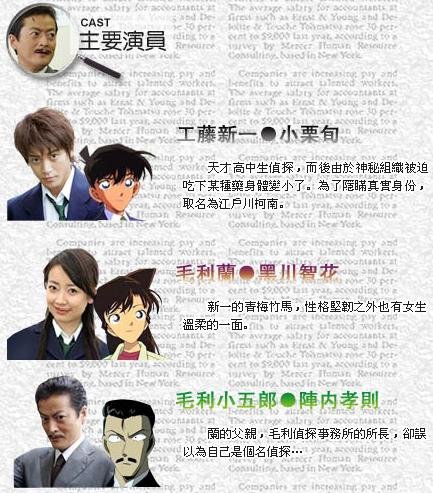 】 近年人气漫画大举入侵日本电视剧及电影界,包括《TOUCH》、《鬼太郎》、《相聚一刻》及《死亡笔记》先后开拍成真人版后,日本NTV电视台去年亦秘密筹拍《名侦探柯南》,令这股热潮推至顶峰。 在《樱桃小丸子》等漫画作品成功改编成电视剧后,风靡10年的《名侦探柯南》也终于要以真人电视剧的形式和广大观众见面。为了纪念《名侦探柯南》动画播出10周年,小学馆在今年展开了以10周年纪念剧场版《侦探们的镇魂歌》为首的的大量柯南新企划,而最新的企划就是一部单集的柯南真人电视剧。 这次的舞台架设在柯南喝下变小药以前,以高中生侦探工藤新一的身份来展开剧情,也就是说剧中将不会出现柯南这一角色,故事将以新一和青梅竹马的毛利兰视点展开,超人气“花样男子”小栗旬出演工藤新一,据说这个新一是青山刚昌老师亲自推荐的,毛利兰由新扎偶像黑川智花扮演,实力派男演员阵内孝则饰演毛利小五郎一角,演员阵容还是相当豪华,电视剧预定在今年秋天于读卖电视和日本电视频道中播出。 【登场人物】
