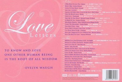 : CD 1 01. I Was Born To Love You -Queen 日剧《冰之骄子》主题曲 02. Better Man -Robbie Williams 林忆莲《Better Man》英文原曲 03. Listen To Your Heart -Roxette 关淑怡《这是我心理对白》英文原曲 04. true true -CAGNET 日剧《恋爱世纪Love Generation》主题曲 05. Against All Odds(Take A Look At Me Now) -Phil Collins电影《危情Against All Odds》主题曲 06. Take My Breath Away -Berlin 电影《壮志凌云 Top Gun》主题曲 07. Only Love -Trademark 电视剧《妙手仁心》插曲 08. Take Me To Your Heart -Michael Learns To Rock张学友《吻别》改编英文版 09. It Might Be You -Stephen Bishop 电影《杜丝先生Mr.Tootsie》主题曲 10. Moonlight Shadow -Mike Oldfield featuring Maggie Reilly林志美《月影》英文原曲 11. Under The Moonlight -Natalie Burks 电视剧《壹号皇庭》插曲 12. Turn Back Time -Aqua 电影《缘份两面睇Sliding Door》插曲 13. Never Had A Dream Come True -S Club 7 14. I've Never Been To Me -Charlene 周慧敏《孤单的心痛》英文原曲 15. How Am I Supposed To Live Without You -Michael Bolton 16. Save The Best For Last -Vanessa Williams 关淑怡《为何是我们》英文插曲 CD 2 01. Making Love(Out Of Nothing At All) -Air Supply 电影《史密夫决战史密妻Mr.&Mrs.Smith》插曲 02. Heaven Is A Place On Earth -Belinda Carlisle 03. And I Love You So -Don McLean台湾电视剧《流星花园》插曲 04. Sandy -John Travolta电影《油脂Grease》插曲 05. Rhythm Of The Rain -Gary Lewis & The Playboys 06. (Where Do I Begin)Love Story -Shirley Bassey 07. Close To Me -Natalie Burks 电视剧《壹号皇庭》插曲 08. Don't It Make My Brown Eyes Blue -Crystal Gayle 刘美君《你说甜蜜我说苦》英文原曲 09. Waiting For A Girl Like You -The Foreigner 蓝妹啤酒电视广告歌曲 10. Only You -The Flying Pickets 谭咏麟《只有你》英文原曲 11. Please Don't Fall In Love -Cliff Richard 12. Love Is All Around -Wet Wet Wet 电影《四个婚礼,一个葬礼 Four Weddings And A Funeral》主题曲 13. Emotion -Samantha Sang 草蜢《旧唱片》英文原曲 14. I Still Believe -Brenda Starr 林忆莲《依然》英文原曲 15. Total Eclipse Of The Heart -Bonnie Tyler 16. Broken Hearted Me -Anne Murray 谭咏麟《情不变》英文原曲