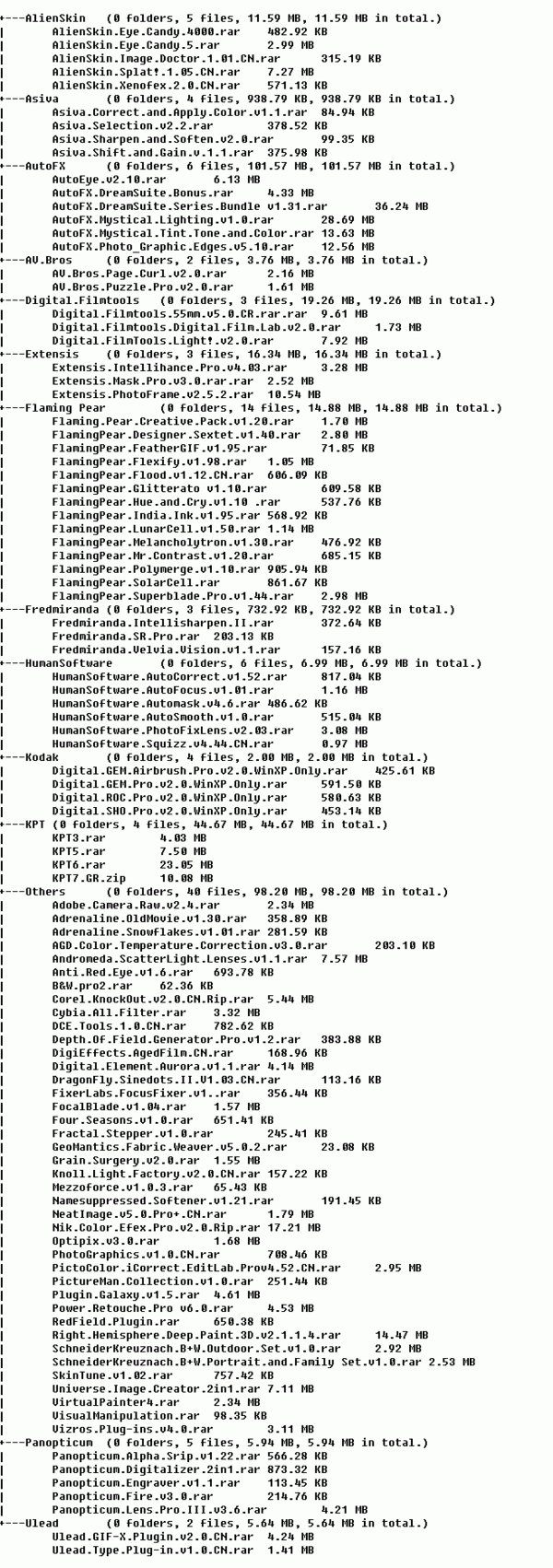 这些插件都是我长期以来收集的,经过一个星期的筛选和整理,全部做成绿色版(有些原来就是绿色的,不敢居功),全部都是破解版本或者附带注册码(鸡),并且全部经过本人亲自测试。