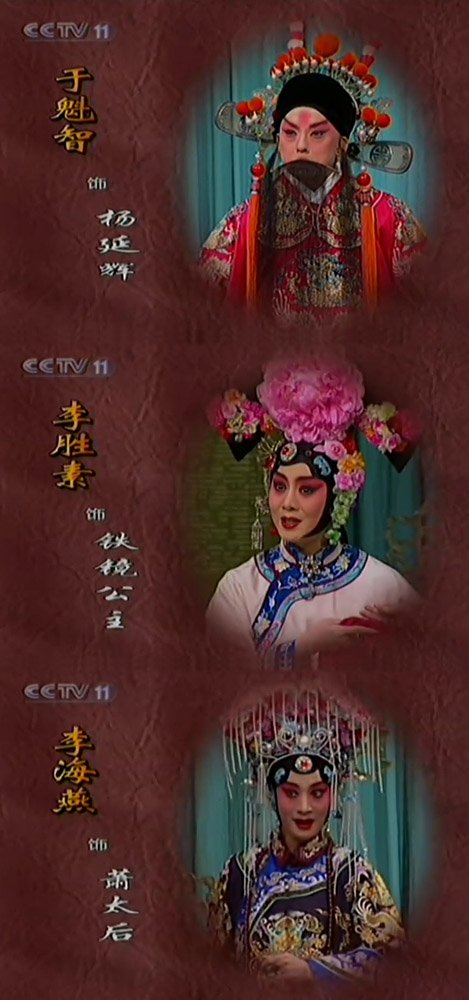 剧中人物演员 杨延辉——于魁智 铁镜公主—李胜素 管波 萧太后——李海燕 杨宗保——江其虎 佘太君——郭瑶瑶 杨六郎——翟建东 大国舅——郑岩 二国舅——陈国森 操琴:赵建华、李亦平、胡启明 司鼓:苏广忠、赵琪、孙宇 主要演员介绍 于魁智