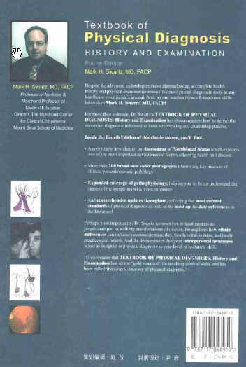 10 of 10 people found the following review helpful: Better than Bates!, July 3, 2005 Reviewer: J. MATHARU - See all my reviews (REAL NAME) Im disappointed that I did not have this book sooner in my student career. For the last 2 years we have been using Bates and quite frankly Bates is okay for the most part but it leaves out details as to why the test is done. The pictures are better in Swartz. There are sections on differential diags and pathophysiology with each test. This is an amazing textbook. I found out about this text from a visiting professor from the UK. For some reason all the visiting profs we have had from the UK have a certain skill which seems to be a lot better than what we are taught here in the US. They have an EXCELLENT grip on their H&P and treat medicine like an art. I asked which book they were using over there and they said Swartz and the other one by Epstein (also gold). If you feel the Bates is insufficient check this book out. 软件版权归原作者及原软件公司所有,如果你喜欢,请购买正版软件 常驻服务器 donkey server NO 2 [已通过安全检测]金山毒霸 2006 RTM 7.6.0.2041 2006-12-28 [已通过安装测试]window xp sp2 共享服务时间:每天11点am至11点pm(美国时间)(目前尽量多开机供大家分享.)