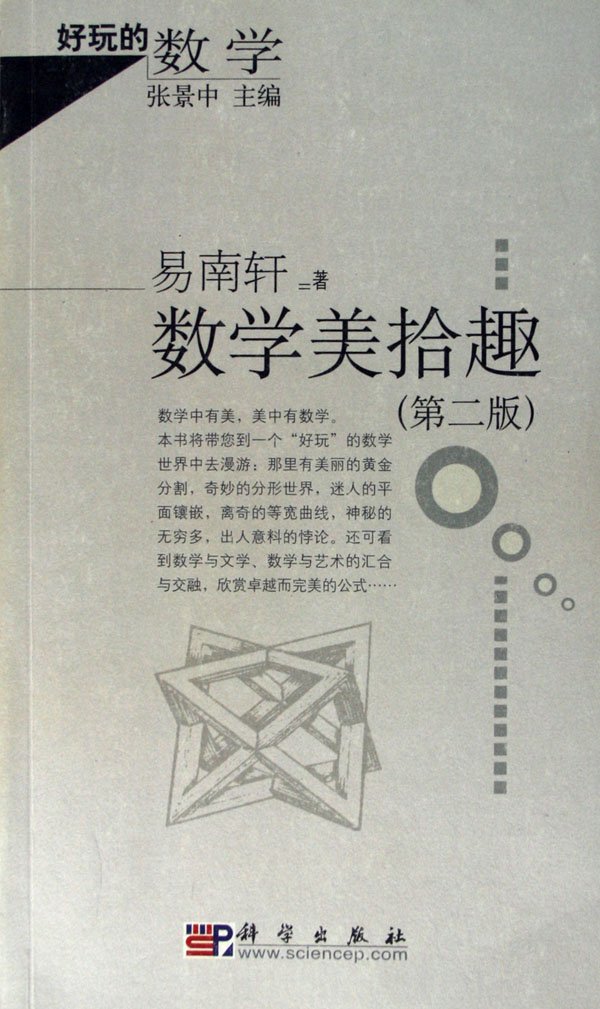 本系列由读书中文网lixiaoshi制作成PDF格式。仅供网友交流,阅后请自动删除。 《不可思议的e》作者:陈仁政著 页数:321页 出版社:科学出版社 出版日期:2005 简介:本书通俗地介绍了对数的发明和这一发明的重大意义,如何用它来解决实际问题,以及常用对数的诞生和应用。 《说不尽的∏》作者:陈仁政著 页数:378页 出版社:科学出版社 出版日期:2005 简介:本书图文并茂,生动详尽地叙述了从古到今人类对π不断加深的认识和艰难曲折的探索,以及有关π的各种知识。 《乐在其中的数学》作者:谈祥柏著 页数:349页 出版社:科学出版社 出版日期:2005 简介:本书共分10章,内容包括:就数与形、逻辑、游戏、古今名题、概率运筹、循环回归、映射反演、文学艺术、书法建筑等方面,谈数学的乐趣。 《中国古算解趣》作者:郁祖权著 黄澍插图 页数:258页 出版社:科学出版社 出版日期:2004 简介:本书以通俗艺术的形式介绍韩信点兵、苏武牧羊、李白沽酒等40余个中国古算名题,讲解了我国古代很有影响的数学方法。 《七巧板、九连环和华容道 中国古典智力游戏三绝》作者:吴鹤龄编著 页数:272页 出版社:科学出版社 出版日期:2004 简介:本书介绍了七巧板、九连环和华容道三大古典智力游戏,对这三个游戏的起源、发展和演变作了详尽的叙述和考证,重点讨论了其中的数学问题。 《数学演义》作者:王树禾著 页数:308页 出版社:科学出版社 出版日期:2004 简介:本书对古今中外著名的数学故事用演义文体进行通而不俗、深入浅出的论述,例如十进制二进制的故事、兔子序列与优选法等。 《趣味随机问题》作者:孙荣恒著 页数:281页 出版社:科学出版社 出版日期:2004 简介:本书分为概率论、数理统计、随机过程三部分,每部分包括若乾趣味问题,例如分赌注问题、波利亚坛子问题等。 《数学聊斋》作者:王树禾著 页数:417页 出版社:科学出版社 出版日期:2004 简介:本书主要内容包括数学悖论、混沌、数学思想与数学哲学中的敏感问题等共计151个问题,全书集知识性、思想性和趣味性于一体。 《数学美拾趣》作者:易南轩著 页数:300页 出版社:科学出版社 出版日期:2004 简介:本书将数学中美的精彩内容的片段摘出,从艺术和思维的角度加以欣赏;或是阐述某一个事物与数学的联系,从中体现出一种数学美。 《幻方及其他 娱乐数学经典名题》作者:吴鹤龄编著 页数:359页 出版社:科学出版社 出版日期:2004 简介:本书分为两部分。第一部分是介绍百变幻方——娱乐数学第一名题,对古今中外在幻方研究中的发现和成果有极为详细的介绍。第二部分是娱乐数学其他经典名题,包括数字哑谜、数学金字塔、素数、完美数、自守数、累进可除数,以及“数学黑洞”现象、棋盘上的哈密顿回路、八皇后问题、梵塔、重排九宫等问题。 数学真的好玩吗?不同的人可能有不同的看法。有人会说,陈省身先生认为数学好玩,因为他是数学大师,他懂数学的奥妙。对于我们凡夫俗子来说,数学枯燥,数学难懂,数学一点也不好玩。 其实,陈省身从十几岁就觉得数学好玩。正因为觉得数学好玩,才兴致勃勃地玩个不停,才玩成了数学大师。并不是成了大师才说好玩。 所以,小孩子也可能觉得数学好玩。 当然,中学生或小学生能够体会到的数学好玩,和数学家所感受到的数学好玩,是有所不同的。好比象棋,刚入门的棋手觉得有趣,国手大师也觉得有趣,但对于具体一步棋的奥妙和其中的趣味,理解的程度却大不相同。 开始提到,数学的好玩有不同的层次和境界。数学大师看到的好玩之处和小学生看到的好玩之处会有所不同。就这套丛书而言,不同的读者也会从其中得到不同的乐趣和益处。可以当做休闲娱乐小品随便翻翻,有助于排遣工作疲劳、俗事烦恼;可以作为教师参考资料,有助于活跃课堂气氛、启迪学生心智;可以作为学生课外读物,有助于开阔眼界、增长知识、锻炼逻辑思维能力。即使对于数学修养比较高的大学生、研究生甚至数学研究工作者,也会开卷有益。数学大师华罗庚提倡“小敌不侮”,上面提到的两个小题目都有名家做过。丛书中这类好玩的小问题比比皆是,说不定有心人还能从中挖出宝矿,有所斩获呢。哆嗦不少了,打住吧。谨以此序祝《 好玩的数学》 丛书成功。 声明:已通过安全检测 杀毒软件:卡巴斯基反病毒 版本: Personal Pro 5.0.391 病毒库:2006-12-8 22:30:02 在线时间:不定时,供源期间有时零点以后挂机 供源带宽:ADSL 512 常驻服务器:DonkeyServer No2 PS:与另一《好玩的数学》有九本相同,不同之处在于《数学美拾趣》这本,是更清晰的版本。