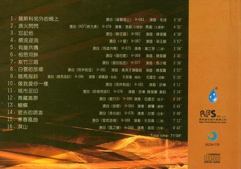 : 01.莫斯科郊外的晚上 [选自《留声湖上》演唱:毛珂] 02.渔火闪闪 [选自《HiFi新元素》 演奏:张毅(小提琴)马瑜(大提琴)] 03.忘记他 [选自《醉花荫》演唱:陈洁丽] 04.顺流逆流 [选自《十爱》演唱:梁玉嵘] 05.有谁共鸣 [选自《有谁共鸣》演奏:黄江琴(二胡)] 06.相思河畔 [选自《爱的歌》演唱:陈洁丽] 07.紫竹三唱 [选自《爱的秘笈》演唱:马小倩] 08.白云的故乡 [选自《雨林制造》演唱:青燕子演唱组 领唱:陈洁丽] 09.饿马摇铃 [选自《饿马摇铃》演奏:余其伟(椰胡)缪晓铮(琵琶)伍国忠(洞箫)] 10.象我爱你一样 [选自《雨林制造》演唱:许乐] 11.城市足印 [选自《聆极物语4》演唱:许乐 陈洁丽 黄韵] 12.青藏高原 [选自《戏竹3》演奏:伍国忠(笛子)] 13.蝴蝶 [选自《船歌》演奏:冀瑶(钢琴)] 14.逝去的诺言 [选自《渔光曲》演奏:付娜(古筝)] 15.寒春风曲 [选自《雪底游魂》演奏:余其伟(二胡)] 16.溟山 [选自《风之猎》演奏:吴莉(古筝)]