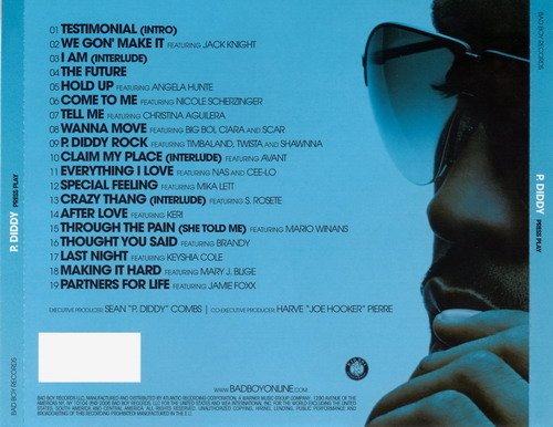 A year in the making, "PRESS PLAY" finds Diddy joined by a who's who of contemporary artists and producers. Among the guest performers are: Christina Aguilera, Mary J. Blige, Jamie Foxx, Big Boi, Timbaland, Brandy, Cee-Lo, Ciara, Keyshia Cole, Nas, Twista, and more. Diddy was joined on the production side by such studio stars as Kanye West, Just Blaze, Pharrell Williams, Havoc from Mobb Deep, Will.I.Am from the Black Eyed Peas, and Rich Harrison, among others.