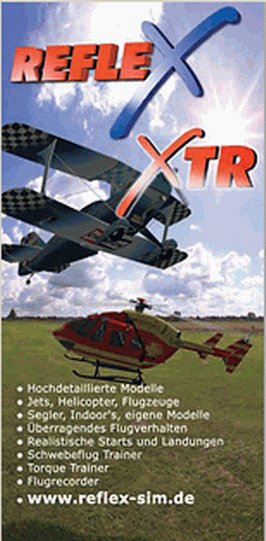 REFLE XTR 遥控飞行模拟器是目前在国内能找到的版本最新、仿真程度最高、相关设置最简单、安装过程最方便的遥控飞行模拟器,目前在国内出现的就是最新的版本(德文原版),中文版补丁目也可以在模拟器里安全地运行了,这真是模型界里的一大福音。