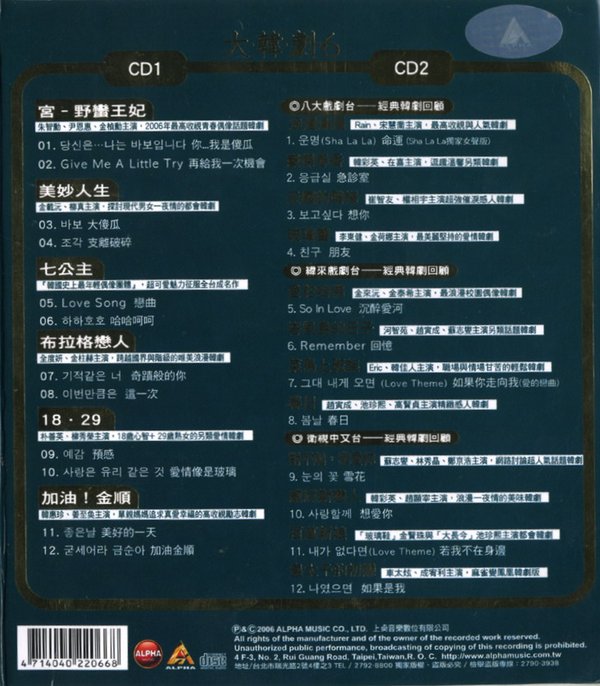 独家收录“宫—野蛮王妃”,“美妙人生”,7公主,“布拉格恋人”,“18 29”,“加油金顺”等2006年最新超人气,高收视韩剧畅销主题曲。