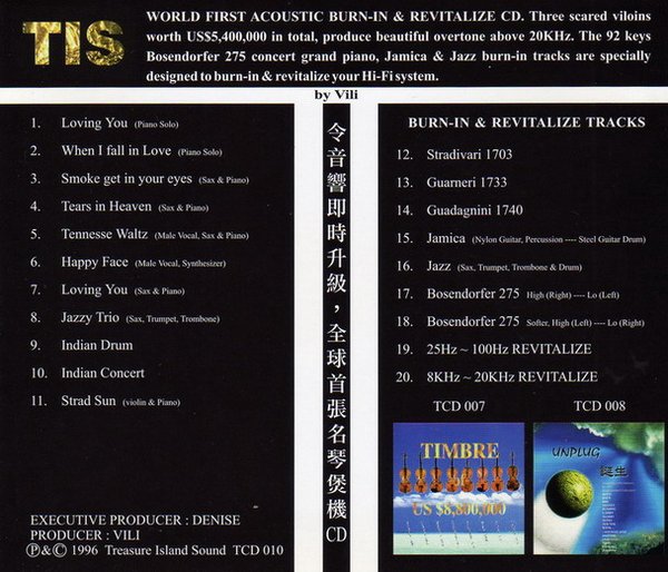 本碟可说是TIS的精选集,香港TIS最近红遍了半边天,有很多张CD在唱片市场持续热卖,录音及音乐性都很杰出。本精选集有最深情感性的萨克斯风演奏Tears in heaven,也有钢琴醉心演绎When I fall in love及其他精彩的演奏及演唱值得欣赏之外,最后并使用三只价值五百四十万美金的小提琴及Bosendorfer 275钢琴演奏,所以到20KHz泛音仍然非常丰富,而且小提琴的高速动态瞬变,比一般电子讯号产生的煲机CD所煲出来的频宽及音色更快、更准确、更有音乐味。透过这一张CD其中几轨,以自然乐器由最低到最高音反覆演奏,反覆煲机,不但令新机更有音乐味,更不会有机械讯号煲出来的生硬音色及没有弹力,有别於一般以电子讯号或FM调协器的电台讯号,所Run出来不自然及频宽不良的声音。