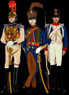 法兰西大陆军大体上分为重装骑兵、轻装骑兵、步兵、炮兵和工兵。其中重装骑兵(左)被推为当时欧洲最强。重装骑兵除勇猛善战外,士兵的军服也极为豪华。蓝色的上装,外面罩有钢制的胸甲,胸甲表面嵌有黄铜板和铜钉。下身是白色半长裤和长筒马靴,头盔是带翎饰的古典式铜盔。担任侦察和追迹的轻装骑兵(中)的服装也较为华丽,蓝色窄袖短上衣,腰系饰带,下穿黄镶边的蓝色马裤和长筒靴,头上是带翎饰的平顶圆筒帽。 步兵正装的色彩是以法国国旗的红蓝白为基调,上身为白翻领的蓝色燕尾服和白色背心,下身是带绑腿套的白色半长裤和带鞋钉的皮鞋。军帽为带绒球的平顶圆筒帽。(右)