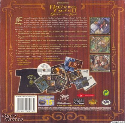《博德之门Ⅱ——安姆的阴影》的故事再次由主角不寻常的身份展开,主角虽然打败了欲置他于死地的沙洛佛克,但他的另外一个兄弟——艾瑞尼卡斯正私下策划如何偷取他的灵魂以达到继承巴尔神力的目的。游戏的主题不再是欧美RPG老套的拯救世界,而是去夺回属于自己的一切。游戏仍然采用改良的Infinity引擎,场景宏伟而不失细腻,魔法效果绚丽多彩。游戏秉承一代大受好评的NPC互动系统,不同阵营的NPC会起内讧,甚至能与某些NPC谱写一段罗曼史。而博德系列的最大特色还是因为它是基于“专家级龙与地下城”规则开发的电脑游戏,它将“被遗忘的国度”中最美丽的费伦大陆展现在玩家面前,你有什么理由能拒绝这段如史诗般壮丽的冒险呢?