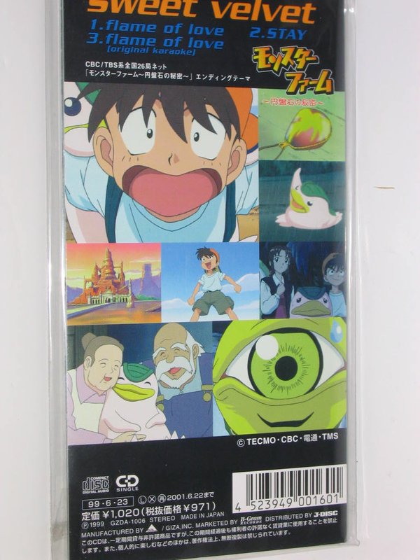 这张CD是GIZA STUDUO着名乐队SWEET VELVET在1999年发售的第二张单曲.同时作为动画モンスターファーム~円盘石の秘密~的片尾曲,人气一升再升.作为GIZA公司旗下的老牌乐队之一,SWEET VELVET给我们带来的是很棒的音乐作品.C/W曲则是非常不错的POP曲,出道单曲则是作为人气动画守护月天的TM曲,有着不错的销量.